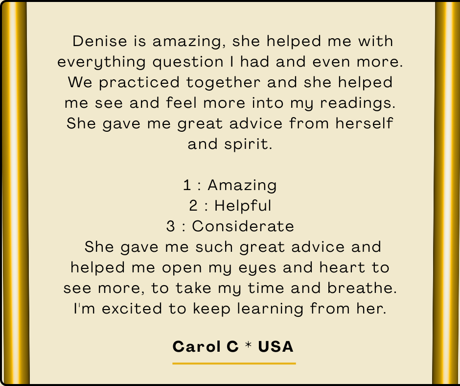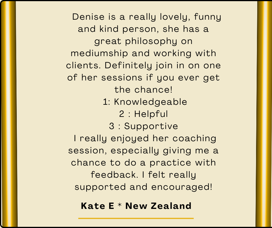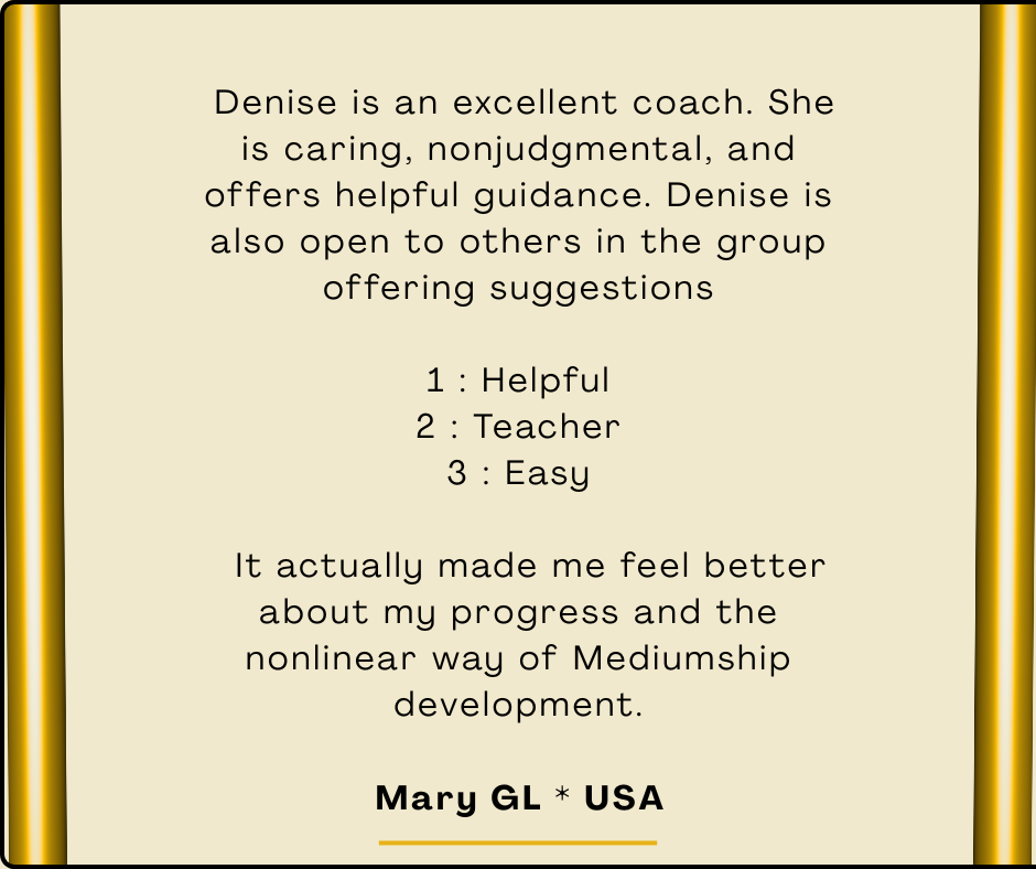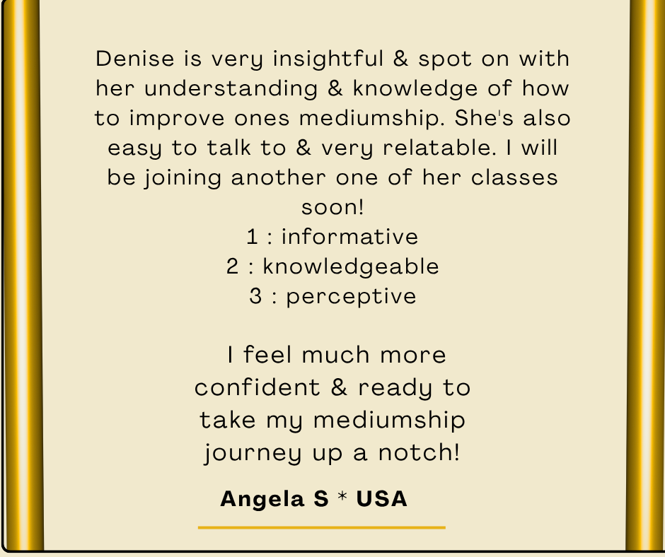 Denise is not only a medium but also a dedicated mentor. She shares her knowledge and skills with students through a variety of formats: